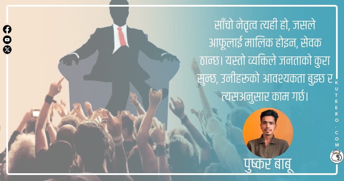 साँचो नेतृत्व त्यही हो, जसले आफूलाई मालिक होइन, सेवक ठान्छ। यस्तो व्यक्तिले जनताको कुरा सुन्छ, उनीहरूको आवश्यकता बुझ्छ र त्यसअनुसार काम गर्छ। ऊ जनतासँग दूरी