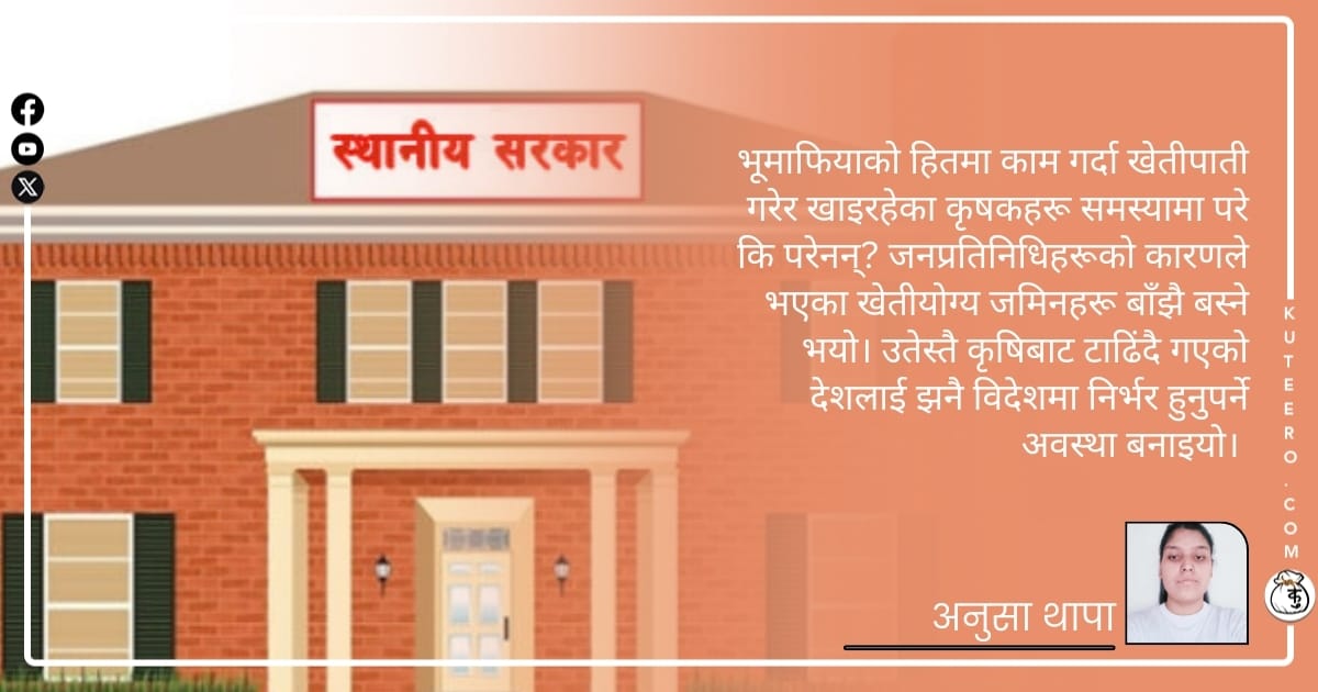 भूमाफियाको हितमा काम गर्दा खेतीपाती गरेर खाइरहेका कृषकहरू समस्यामा परे कि परेनन् ? जनप्रतिनिधिहरूको कारणले भएका खेतीयोग्य जमिनहरू बाँझै बस्ने भयो । उतेस्तै कृषिबाट टाढिंदै