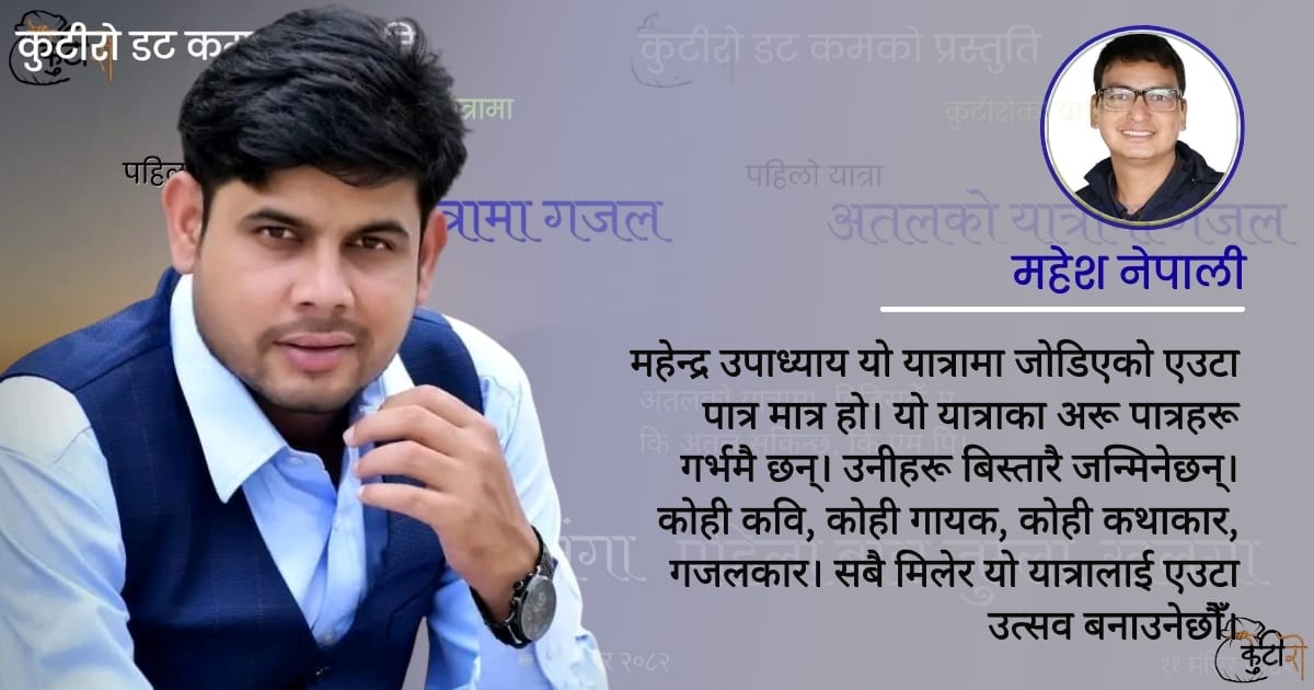 उपलब्धि भन्नु कुटीरोले तय गरेको ‘अतलको यात्रा’। महेन्द्र उपाध्यायको गजल यात्रा। देशभर कम्तीमा १० सहरमा पुग्ने यो कार्यक्रम जुम्लाबाट सुरु हुँदैछ। मंसिर ११ गते।
