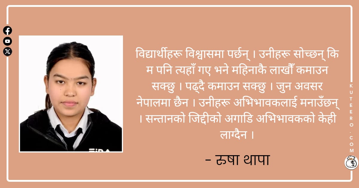विद्यार्थीहरू विश्वासमा पर्छन् । उनीहरू सोच्छन् कि म पनि त्यहाँ गए भने महिनाकै लाखौँ कमाउन सक्छु । पढ्दै कमाउन सक्छु । जुन अवसर नेपालमा छैन । उनीहरू अभिभावकलाई मनाउँछन् । सन्तानको जिद्दीको अगाडि अभिभावकको केही लाग्दैन । अन्ततः अभिभावक मान्छन्, छोराछोरीलाई अमेरिका, अस्ट्रेलिया पठाउन ।
