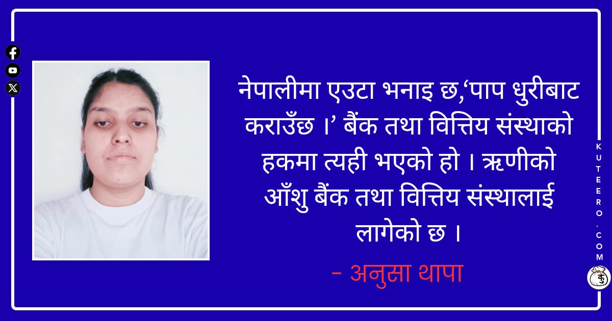 नेपालीमा एउटा भनाइ छ,‘पाप धुरीबाट कराउँछ ।’ बैंक तथा वित्तिय संस्थाको हकमा त्यही भएको हो । ऋणीको आँशु बैंक तथा वित्तिय संस्थालाई लागेको छ । ३५ हजार २३९ वटा सहकारीले करोडौं बचतकर्ताको खर्बौं बचतकर्ता खाइदियो । धेरै सहकारी बन्द भइसकेको छ । सहकारीका सञ्चालकहरु फरार छन्।