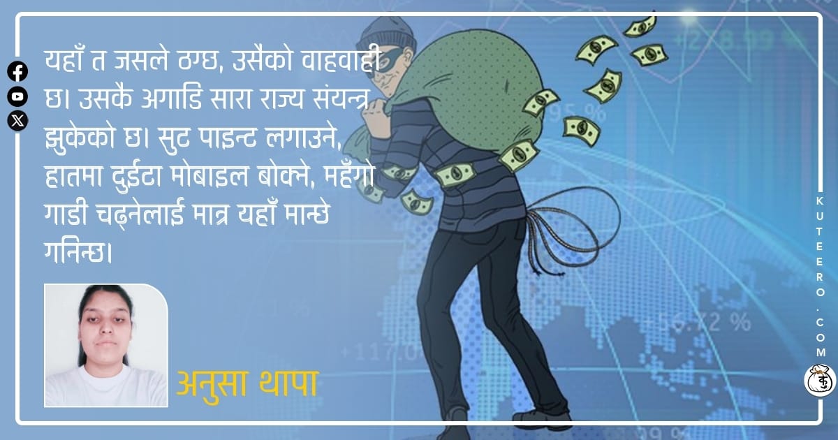 यहाँ त राज्यले नै ठग्न सिकाइरहेको छ । कीर्ते मूल्य कायम गर्ने, सिन्डिकेट लगाउने, जनता ठग्नेलाई राज्यले नै संरक्षण गरिरहेको छ । उनीहरूले लुट्छन्, प्रहरीले समात्छ । अदालतले धरौटीमा छोडिदिन्छ । उनीहरू बाहिर आएर त्यही ठग्ने पेशा चलाउँछन् । सहकारीमा बचत गर्नेहरू औषधि किन्न पैसा नभएर मरिरहेका छन्, रविजस्ता व्यक्तिहरू करोडौँ धरौटी राखेर निस्किरहेका छन् ।