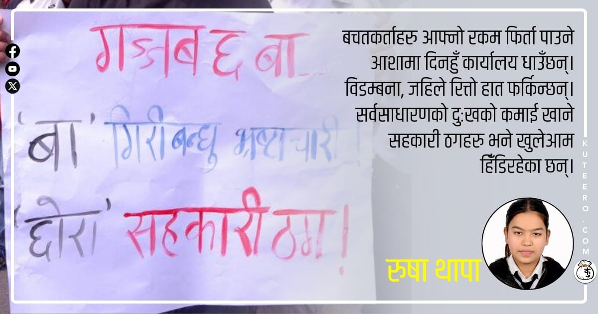 सहकारीमा बचतकर्ताले राखेको करोडौं रकम हिनामिना गरे । अनि बचतकर्ता पैसा माग्न आएपछि चाँहि भागे । सहकारी समस्या बल्झिएको पाँच वर्ष बितिसकेको छ । आफ्नो निक्षेप फिर्ताका निम्ति बचतकर्ताहरु कहिले आन्दोलन गर्छन् त कहिले अनशन बस्छन् । तर, उनीहरुको निक्षेप फिर्ता भएको छैन । देशभर ३५ हजार २३९ वटा सहकारी दर्तामा छन् । ती सहकारीमा करोडौं बचतकर्ताले खर्बौ रकम राखेका थिए ।