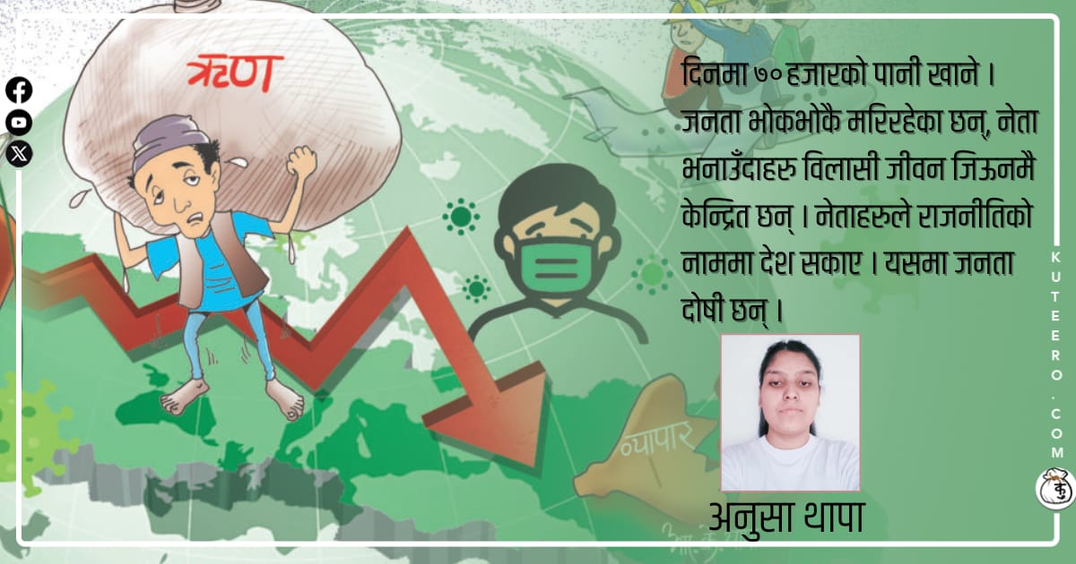 मुलुक वैदेशिक ऋणको दलदलमा फसिरहेको छ । वैदेशिक ऋण २९ खर्ब ४२ अर्ब नाघिसकेको छ । सो ऋणको ब्याजमै वर्षेनि ठूलो रकम खर्च हुने गरेको छ । महालेखा परीक्षकको कार्यालयले सरकारको आम्दानीभन्दा खर्च बढी भएको बताउँदै आएको छ । राजनीतिक दलहरुले राजनीतिलाई जागिर बनाए । राजनीतिलाई कमिशन खाने, आफ्नो मान्छे जागिर लगाउने, ठेक्कापट्टा गर्ने थलो बनाइयो । जसको असर आज मुलुकले खेपिरहेको छ ।