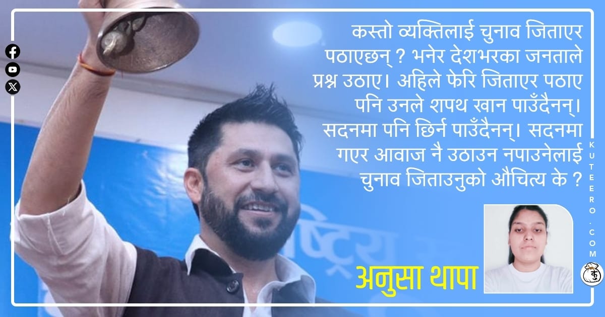 कस्तो व्यक्तिलाई चुनाव जिताएर पठाएछन् ? भनेर देशभरका जनताले प्रश्न उठाए। अहिले फेरि जिताएर पठाए पनि उनले शपथ खान पाउँदैनन्। सदनमा पनि छिर्न पाउँदैनन्। सदनमा गएर आवाज नै उठाउन नपाउनेलाई चुनाव जिताउनुको औचित्य के ?
