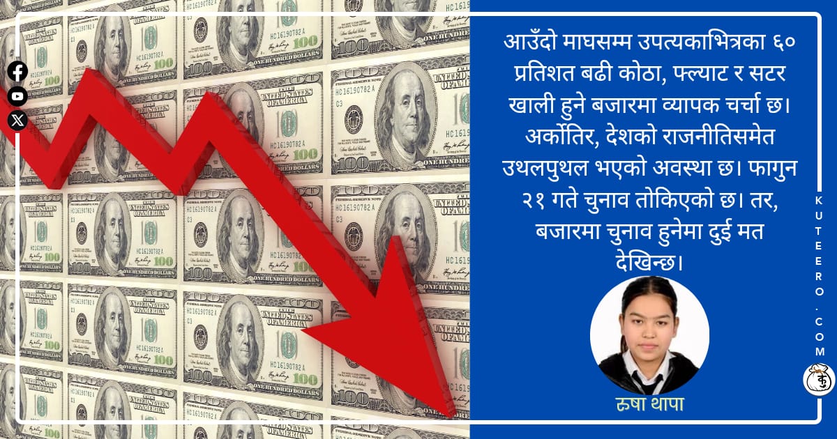 आउँदो माघसम्म उपत्यकाभित्रका ६० प्रतिशत बढी कोठा, फ्ल्याट र सटर खाली हुने बजारमा व्यापक चर्चा छ। अर्कोतिर, देशको राजनीतिसमेत उथलपुथल भएको अवस्था छ। फागुन २१ गते चुनाव तोकिएको छ। तर, बजारमा चुनाव हुनेमा दुई मत देखिन्छ।