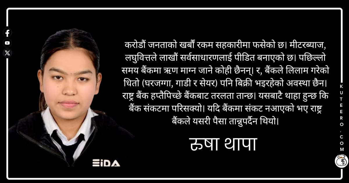 यस्तै, करोडौं जनताको खर्बौं रकम सहकारीमा फसेको छ। मीटरब्याज, लघुवित्तले लाखौं सर्वसाधारणलाई पीडित बनाएको छ। पछिल्लो समय बैंकमा ऋण माग्न जाने कोही छैनन्। र, बैंकले लिलाम गरेको धितो (घरजग्गा, गाडी र सेयर) पनि बिक्री भइरहेको अवस्था छैन। राष्ट्र बैंक हप्तैपिच्छे बैंकबाट तरलता तान्छ। यसबाटै थाहा हुन्छ कि बैंक संकटमा परिसक्यो। यदि बैंकमा संकट नआएको भए राष्ट्र बैंकले यसरी पैसा तान्नुपर्दैन थियो।