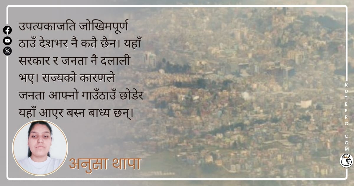 उपत्यकाजति जोखिमपूर्ण ठाउँ देशभर नै कतै छैन । यहाँ सरकार र जनता नै दलाली भए । राज्यको कारणले जनता आफ्नो गाउँठाउँ छोडेर यहाँ आएर बस्न बाध्य छन् ।