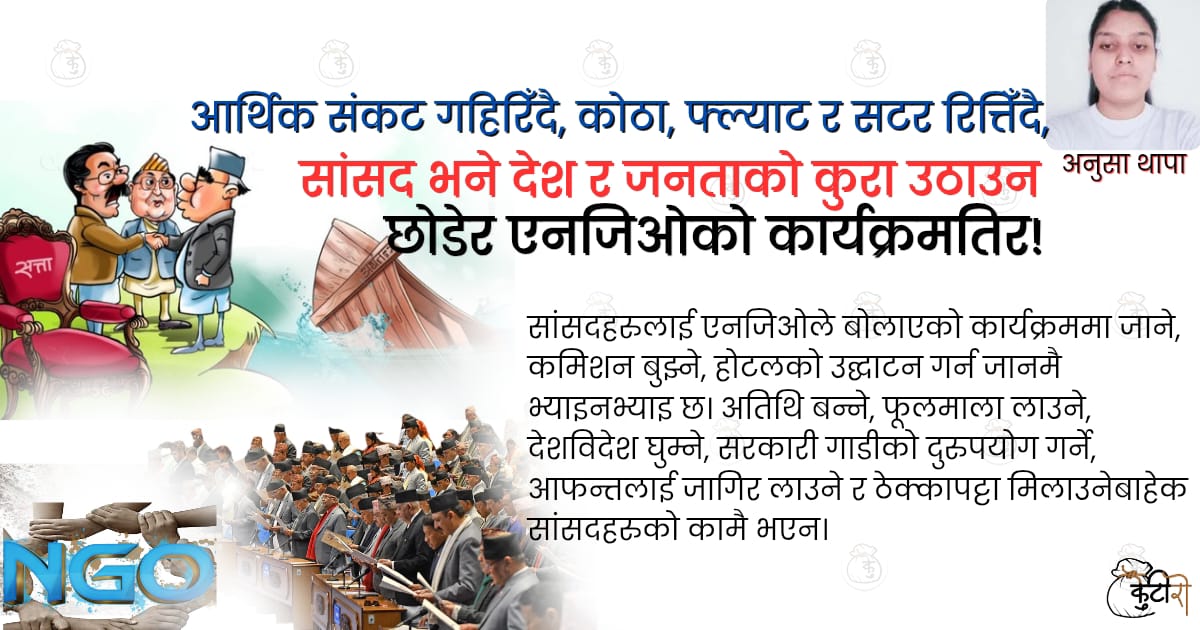 सांसदहरुलाई एनजिओले बोलाएको कार्यक्रममा जाने, कमिशन बुझ्ने, होटलको उद्घाटन गर्न जानमै भ्याइनभ्याइ छ। अतिथि बन्ने, फूलमाला लाउने, देशविदेश घुम्ने, सरकारी गाडीको दुरुपयोग गर्ने, आफन्तलाई जागिर लाउने र ठेक्कापट्टा मिलाउनेबाहेक सांसदहरुको कामै भएन।