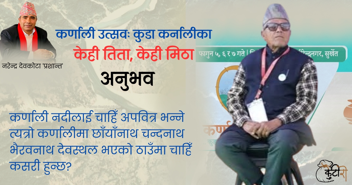 “यहि फागुन ५ देखि ७ गते सम्म सुर्खेतको वीरेन्द्रनगरस्थित सिटी हलको आँगनमा आयोजना हुने कर्णाली उत्सव: कुडा कर्नालीका छैटौं संस्करणको सफलताको शुभकामना! भन्दै जुम्लाकी माननीय सांसद कान्तिका सेजुवालले पोष्ट गरेको शुभकामना स्टाटसमा मेरा आँखा अडिए।