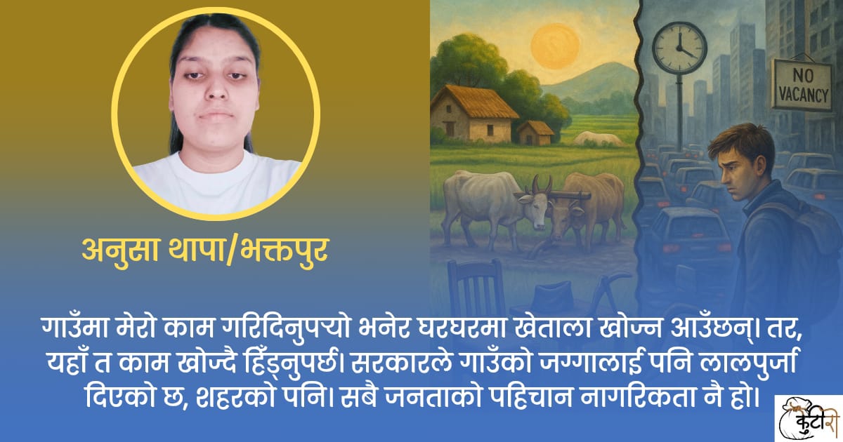 गाउँमा मेरो काम गरिदिनुपर्‍यो भनेर घरघरमा खेताला खोज्न आउँछन्। तर, यहाँ त काम खोज्दै हिँड्नुपर्छ। सरकारले गाउँको जग्गालाई पनि लालपुर्जा दिएको छ, शहरको पनि। सबै जनताको पहिचान नागरिकता नै हो।