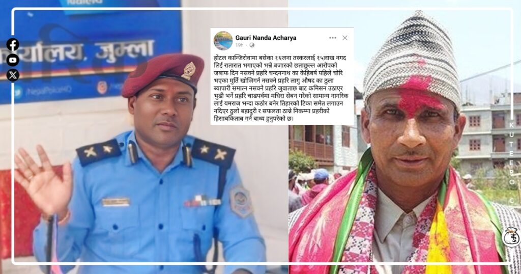 उनले प्रहरीलाई लागेको गम्भीर आरोपबारे प्रहरी प्रशासनले कुनै सन्तोषजनक जवाफ दिन नसकेको दाबी पेस गरेका छन्। जिल्ला समन्वय समिति जुम्लाका प्रमुख गौरीनन्द आचार्यले सामाजिक सञ्जाल फेसबुकमा जुम्लाको सुरक्षा चुनौतीमाथि गम्भीर टिप्पणी गरेका छन्। आचार्यले जुम्लामा तस्करी, लागुऔषध र चोरीजस्ता गम्भीर अपराधहरूमा संलग्न अभियुक्तलाई पक्राउ गर्न नसक्ने प्रहरीप्रति आक्रोश व्यक्त गर्दै आफ्नो फेसबुक स्टाटसमा, ‘जिल्लाको सुरक्षा […]
