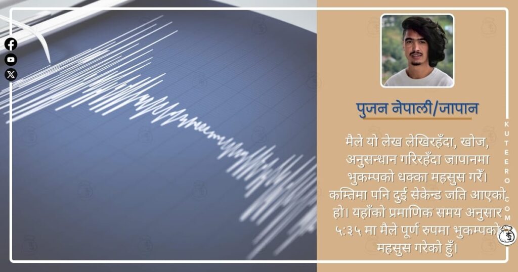 मैले यो लेख लेखिरहँदा, खाेज, अनुसन्धान गरिरहँदा जापानमा भुकम्पकाे धक्का महसुस गरेँ। कम्तिमा पनि दुई सेकेन्ड जति आएकाे हाे। यहाँकाे प्रमाणिक समय अनुसार ५:३५ मा मैले पूर्ण रुपमा भुकम्पकाे महसुस गरेकाे हुँ। जापान पनि विश्वमा एक भुकम्प गइरहने देश हाे। विश्वमा भूकम्पको जोखिमको हिसाबले जापान अग्रपंक्तिमा आउँछ। यो ‘रिङ अफ फायर’ (Ring of Fire) मा […]
