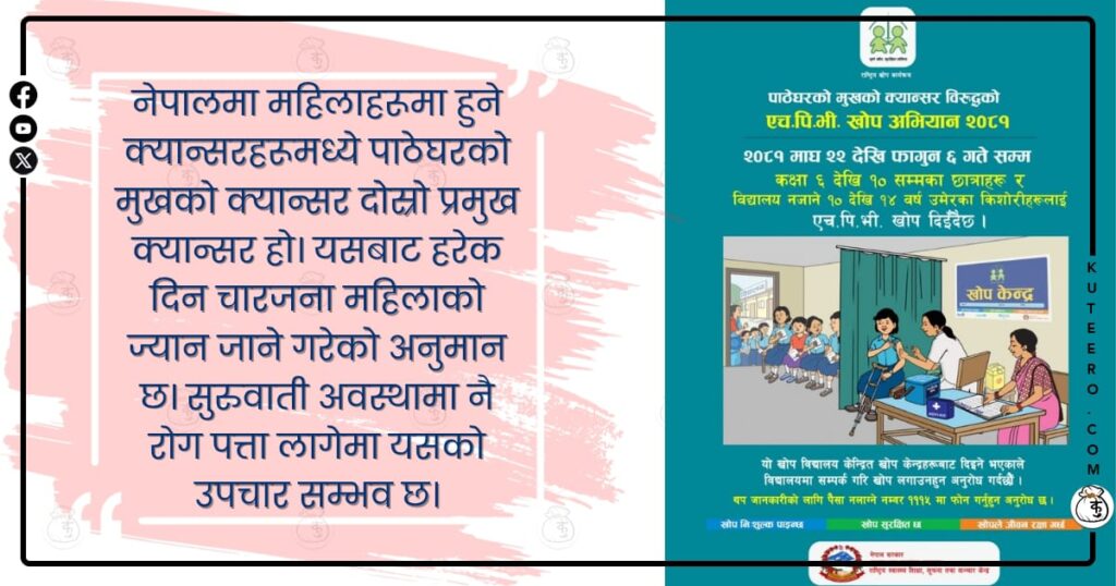 एच.पि.भी. खोप विश्व स्वास्थ्य संगठनले प्रमाणित गरेको सुरक्षित खोप हो। यस खोपले पाठेघरको मुखको क्यान्सर गराउने एच.पि.भी. भाइरसको संक्रमणबाट बचाउँछ। खोप लगाएपछि सामान्य प्रकारका असरहरू, जस्तै टाउको दुख्ने, जिउ दुख्ने वा सूई लगाएको ठाउँमा दुख्ने जस्ता समस्या देखा पर्न सक्छन्, तर ती असरहरू केही समयमै आफैं ठीक हुन्छन्। जुम्लाका आठवटै स्थानीय तहका आठ हजार आठ […]