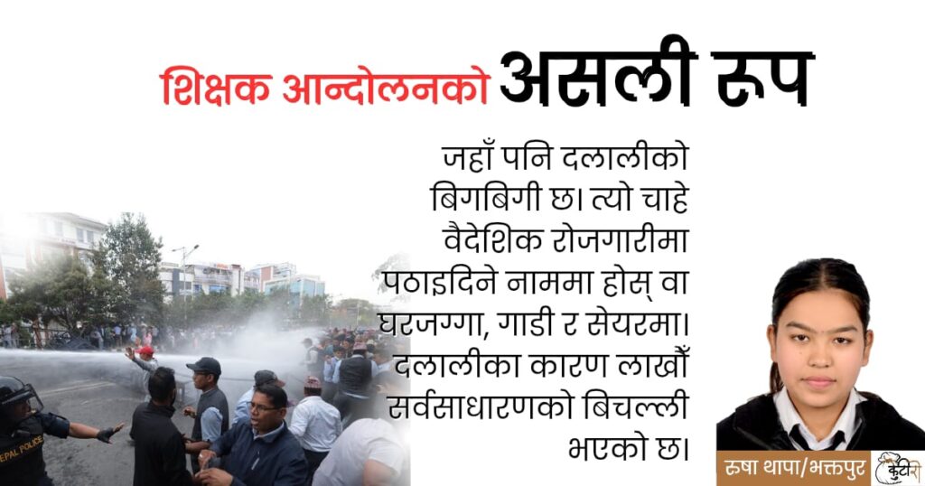 शिक्षकहरूको आन्दोलन कति शान्तिपूर्ण रहेछ, अहिले प्रष्ट भएको छ। बिरुवासमेत नमार्ने दाबी गरेका शिक्षकहरूले आइतबार फुटपाथको ब्लकसमेत निकालेर सुरक्षाकर्मीमाथि प्रहार गरे। सर्वसाधारण जनता स्थानीय सरकारलाई सोध्छन्, ‘आन्दोलनरत शिक्षकहरूलाई किन कारबाही गरिएन? किन जागिरबाट हटाइएन?’ जनताले तिरेको करबाट तलब–भत्ता खाएर शिक्षक–शिक्षिकाहरू विद्यार्थी नपढाई आन्दोलनमा होमिएका छन्। विद्यालय बन्द गरेर सडकमा रमिता देखाइरहेका छन्। यतिमात्र होइन, शिक्षकहरू […]