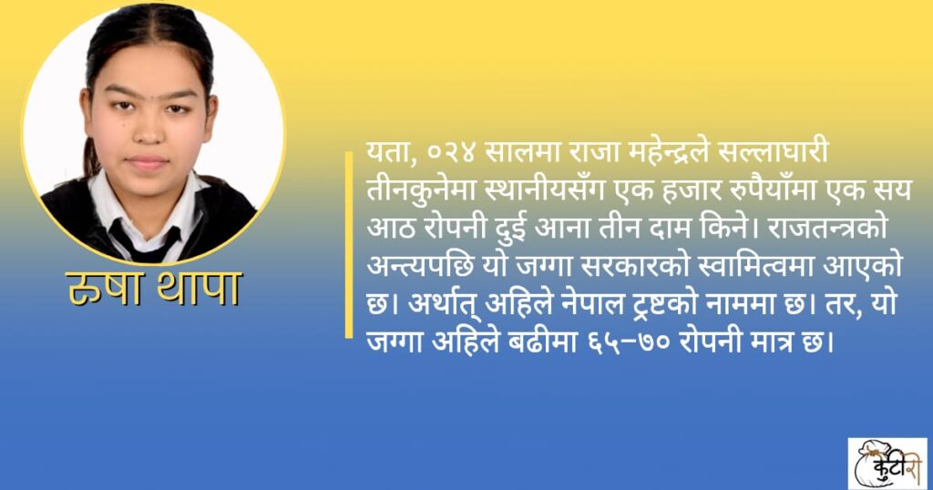 यता, ०२४ सालमा राजा महेन्द्रले सल्लाघारी तीनकुनेमा स्थानीयसँग एक हजार रुपैयाँमा एक सय आठ रोपनी दुई आना तीन दाम किने। राजतन्त्रको अन्त्यपछि यो जग्गा सरकारको स्वामित्वमा आएको छ। अर्थात् अहिले नेपाल ट्रष्टको नाममा छ। तर, यो जग्गा अहिले बढीमा ६५–७० रोपनी मात्र छ। २०४६ सालमा मुलुकमा पञ्चायती व्यवस्था ढलेर बहुदलीय व्यवस्थाको स्थापना भयो। अनि बहुदलीय […]