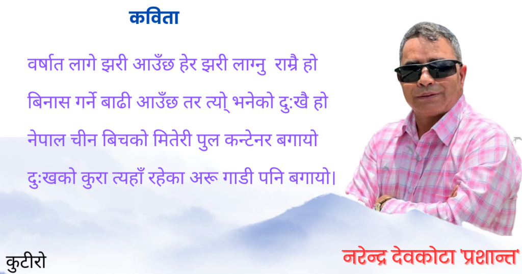 पोहोर पनि गयो परार पनि गकै छ निरन्तरगरिव दुखी जन हरूको काल निश्ठुर छ ईश्वरतीन प्रहरी अरु पव्लिक् समेत अठार बेपत्तै छन्ती अठारको कसरी आशा गर्नु मुटु जलिरहे छन् । कन्टेनर तिँ समेत गाढी जम्मै लियो सबै बगाईराख्ने चाहीँ को थियो बग्नेगरी होस नै नपुर्याईअसार मास तेईस गते राती भोटे कोसी नदीमाआएको बाढीले अठारलाई पुर्यायोकि खाडीमा। वर्षात […]