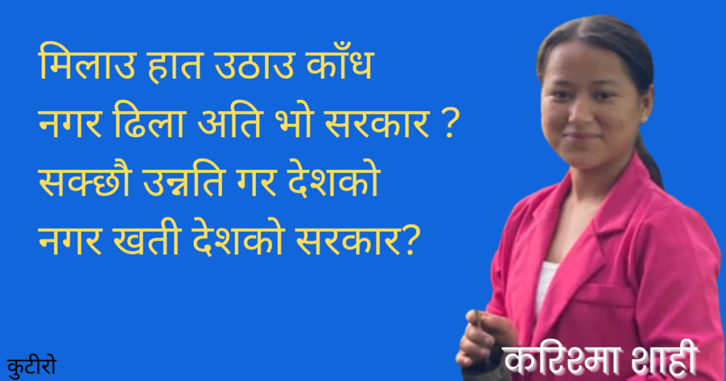 के यो अत्ति भएन सरकार ?विकास रत्ती भएन सरकारगर्न त ठुलो कुरा गर्छौ ।भने जत्तिकै केही भएन सरकार ? ढाट्नु सम्म ढाटेउ जनतालाईफिरेन तिम्रो मति सरकार ?कहिले सम्म गर्कौ नाटकअब अति भयो सरकार ? छोप लाज नहिड नाङ्गोबढाउ तेजले गति सरकार ?नछाड थोत्रा भाषण यहाँदेश अवनति भो सरकार ? मिलाउ हात उठाउ काँधनगर ढिला अति […]