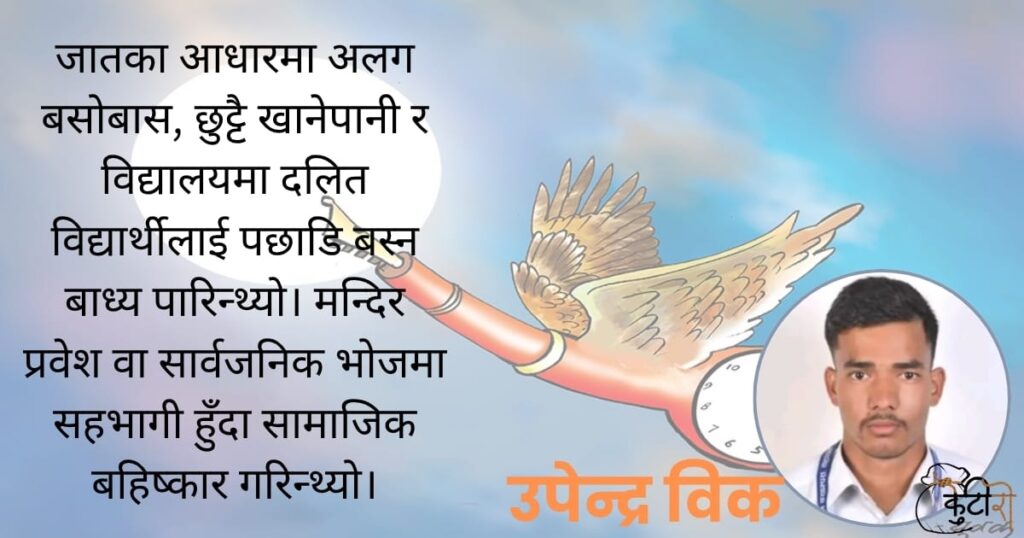 जातका आधारमा अलग बसोबास, छुट्टै खानेपानी र विद्यालयमा दलित विद्यार्थीलाई पछाडि बस्न बाध्य पारिन्थ्यो। मन्दिर प्रवेश वा सार्वजनिक भोजमा सहभागी हुँदा सामाजिक बहिष्कार गरिन्थ्यो। लामो समयदेखि नेपाली समाज जात, लिङ्ग, वर्ग, धर्म, र सांस्कृतिक पहिचानका आधारमा विभाजित रहँदै आएको छ। दलित, जनजाति, महिला, मुस्लिम, थारु, लैङ्गिक तथा यौनिक अल्पसङ्ख्यक समुदायले लामो समयदेखि सामाजिक अपमान र […]
