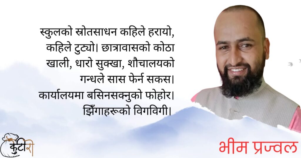 बिहानको झरीसँगै स्कुलको गेट ढिलो खोलिएको थियो। दामोदर सर छाता समाउँदै, हिलैहिलोको बाटो छिचोलेर गेटमा पुगे। गेट खोल्ने सुरेश परैबाट चिच्याउँदै आइरहेको थियो, “आज धेरै ढिला भयो हजुर!” दामोदर सरले मुस्कुराउँदै भन्नुभयो, “ढिला त सधैं हुन्छ नि यहाँ… बदलिएको केही छैन।” स्कुलभित्र छिरेपछि उनको नजर सीधा दश कक्षातर्फ गयो। कक्षामा विद्यार्थीहरू गफमा व्यस्त थिए। टेबुलमा […]