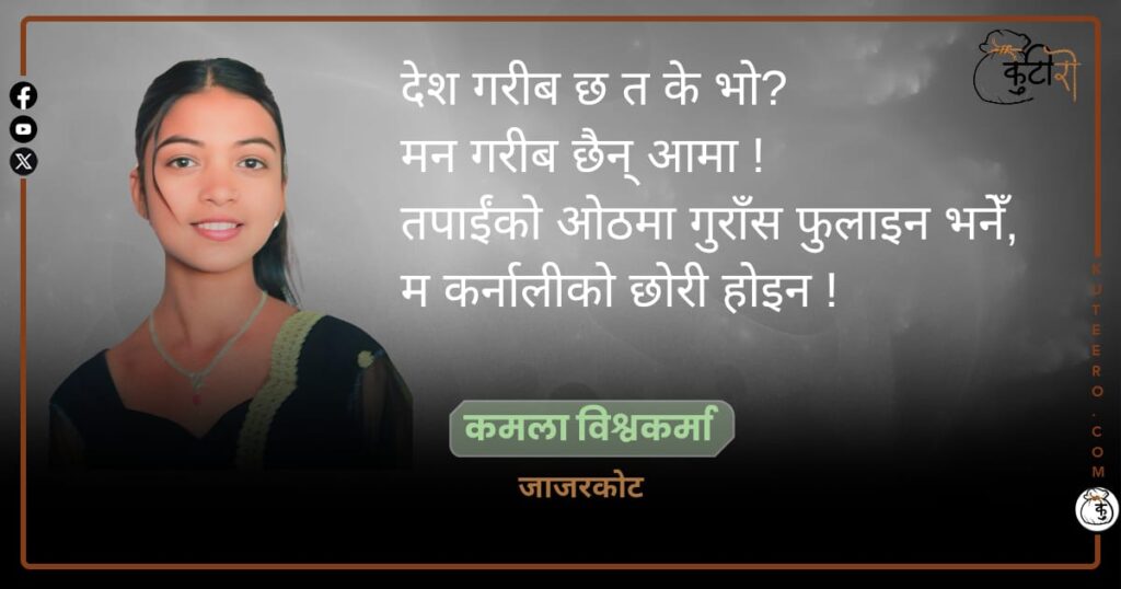 रित्तो भाँडो हेर्दै भन्नुहुन्छ आमाआज केही छैन छोरी !तिम्रो भोक देखेर म अघाएको छु!आँखामा तिम्रो आँसु देखेरयो मन भाँच्चिन्छ कुँडिन्छभोकले पेट कराएको कर्कस आवाजर पल्लो घरबाट आएको खानाको मीठो वासनालेसाँच्चै कति गहिरो प्रश्न सोध्छछोरी ! म तिमीलाई के जवाफ दिउँ ?फाटेका लुगाफाटाले मन टालिदोँ रहेनछच्यातिएका जुत्ताले हिँड्ने इच्छा नमर्दो रहेछसपना त आँखामा छतर किताब हातमा […]