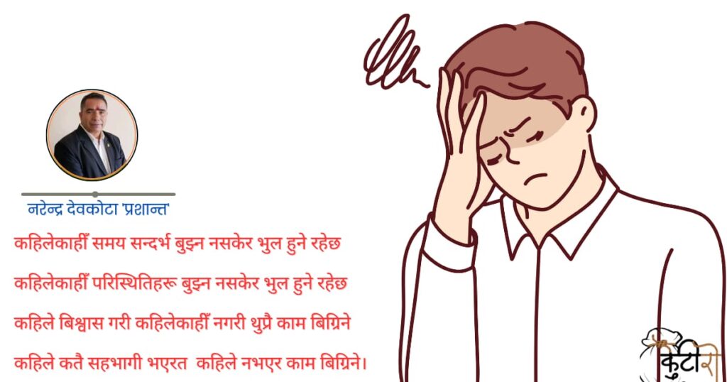 प्रत्येकको जीवनमा भुलहरू भन्ने अनेकौँ हुने रहेछन्अच्चम भुलनै गरिन भनेपनि भुल हुन जाने रहेछन्कहिले समूहबाट भएको कामको अपजस लिनुपर्नेकहिले समूहबाट नभएको कामको अपजस थेग्नुपर्ने । कहिलेकाहीँ समय सन्दर्भ बुझ्न नसकेर भुल हुने रहेछकहिलेकाहीँ परिस्थितिहरू बुझ्न नसकेर भुल हुने रहेछकहिले बिश्वास गरी कहिलेकाहीँ नगरी थुप्रै काम बिग्रिनेकहिले कतै सहभागी भएरत कहिले नभएर काम बिग्रिने । कहिलेकाहीँ […]
