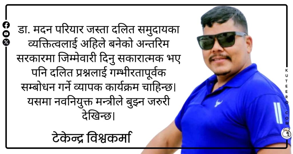 डा. मदन परियार जस्ता दलित समुदायका व्यक्तित्वलाई अहिले बनेको अन्तरिम सरकारमा जिम्मेवारी दिनु सकारात्मक भए पनि दलित प्रश्नलाई गम्भीरतापूर्वक सम्बोधन गर्ने व्यापक कार्यक्रम चाहिन्छ। यसमा नवनियुक्त मन्त्रीले बुझ्न जरुरी देखिन्छ। नेपालको लोकतान्त्रिक यात्रामा दलित समुदायको भूमिका महत्वपूर्ण रहँदै आएको छ। समान अधिकार, न्याय र अवसरका लागि लामो संघर्षपछि आज संविधानले दलित अधिकारलाई संवैधानिक ग्यारेन्टी दिएको […]