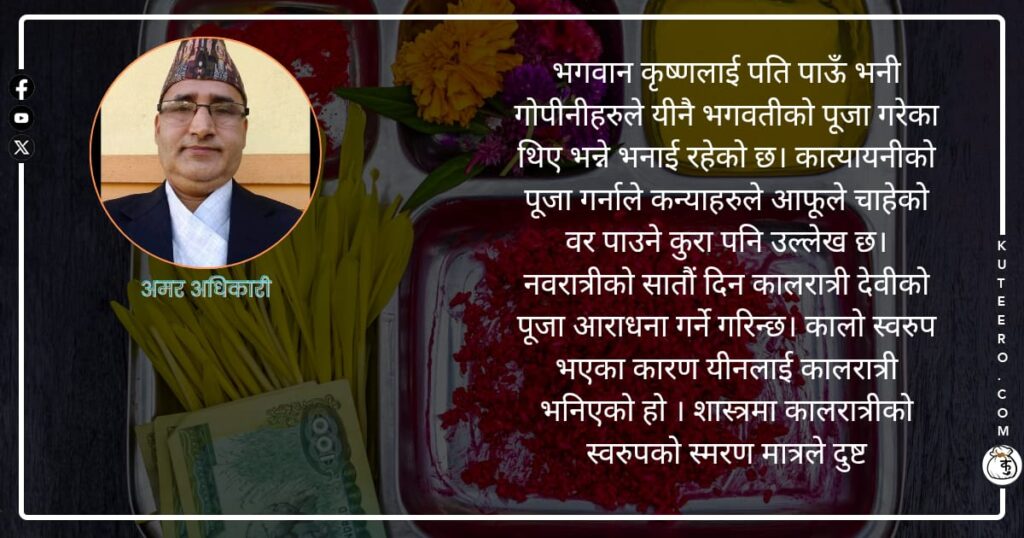 नवरात्रको आठौँ दिन महागौरीको पूरा तथा आराधना गर्ने गरिन्छ। यसदिनलाई महाअष्टमी पनि भनिन्छ । महागौरी आठवर्षको उमेरमै कठोर तपस्यामा लिन हुँदा शरीर कालो भएको थियो र साक्षात् शिवले गंगा जलद्वारा स्नान गराएपछि यीनको शरीर गोरो भएका कारण महागौरी भनिएको हो। यस दिन देवीको बाहन सिंहलाई विधिवत पूजन गर्ने र हात हतियारहरुको पूजा गर्ने प्रचलन पनि रहेको […]