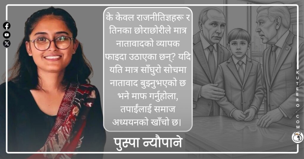 नातावाद र कृपावाद त हरेक टोल विकास समिति देखि विद्यालय, क्याम्पस, प्राइभेट कम्पनीको कर्मचारी बढुवा, अस्पताल, एयरपोर्ट, गाडीको भाडा, सरकारी कार्यालय, राजनीतिक दलका गुट सबै तिर छ। प्रायः बलिउडमा प्रख्यात यो नेपोटिजम अर्थात् नातावाद शब्द अहिले नेपालमा निकै प्रचलित छ। यही शब्दको पृष्ठभूमिमा जेन-जेडको अप्रत्याशित आन्दोलन समेत भयो नेपालमा, जसले सायदै कसैले कल्पना गरेको उथलपुथल […]