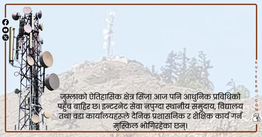 जुम्लाको ऐतिहासिक क्षेत्र सिंजा आज पनि आधुनिक प्रविधिको पहुँच बाहिर छ। इन्टरनेट सेवा नपुग्दा स्थानीय समुदाय, विद्यालय तथा वडा कार्यालयहरूले दैनिक प्रशासनिक र शैक्षिक कार्य गर्न मुस्किल भोगिरहेका छन्। श्री शान्ति जन आधारभूत विद्यालयका प्रधानाध्यापक प्रमान बहादुर रोकायका अनुसार इन्टरनेटको त कुरै छैन, गाउँमा मोबाइल सिग्नल समेत स्थिर छैन। प्रधानाध्यापक रोकायाले भने, “सामान्य फोन गर्न […]