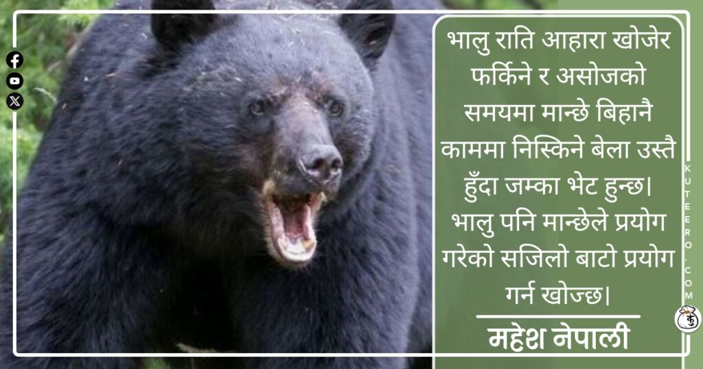 खासगरी पछिल्लो समय भालुलाई आहाराको समस्या परिरहेको छ। पहिलापहिला लेकका खेतबारी बाँझा थिएनन्। आहारा जंगल छेउछाउमै थियोे। अहिले खेतबारी बाँजा छन्। आहाराको खोजीमा भालु गाउँघरमै र बजारमा समेत पुगिरहेको छ। पछिल्लो एक दशकयता जुम्लाका गाउँघरमा र शहर बजारमा समेत भालुले आतंक मच्चाएकाे खबर सञ्चार माध्यममा सम्प्रेषण भइरहेका छन्। उसाे त भालुकाे आक्रमणमा परि घाइते भएका […]