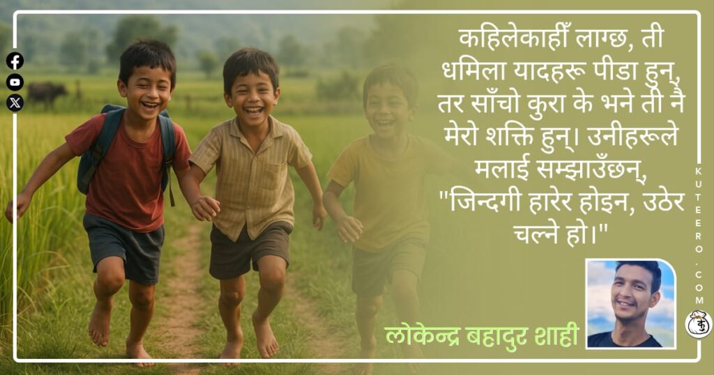 कहिलेकाहीँ लाग्छ, ती धमिला यादहरू पीडा हुन्, तर साँचो कुरा के भने ती नै मेरो शक्ति हुन्। उनीहरूले मलाई सम्झाउँछन्, “जिन्दगी हारेर होइन, उठेर चल्ने हो।” थकानले ढाकिएको दिनमा ती विगतका सम्झनाहरू नै मेरो आँखा खोल्ने उज्यालो बन्ने गर्छन्। समय त नदीझैँ बग्दै गयो, तर मेरो विगतका धमिला यादहरू मनको कुनामा अझै स्थिर छन्। कहिलेकाहीँ […]
