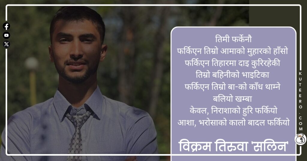 देशले झिनो आस मानेको थियोतिमी आउछौं कि भनीतिम्रो प्रतीक्षामा थियो यो देशविडम्बना, तिमी यस्तो देशमा जन्मियौजुन देशले आफ्ना नागरिकको,रक्षा गर्न सक्दैनर टुलुटुलु हेरिरहन्छलज्जास्पद आँखाले ! विपिन तिम्रो साहस र हिम्मतको,म के खण्डन गरुँतिमीले चाहेको भएसायद, आज तिमी हामी माझ हुन्थ्यौआफ्नो प्रवाह गरेनौं तिमीलेत्यो आतंक हमासले तिम्रो निर्मम हत्या गर्यो तिम्रो जिवित सास पाउनको निम्तितिम्रो आमा […]