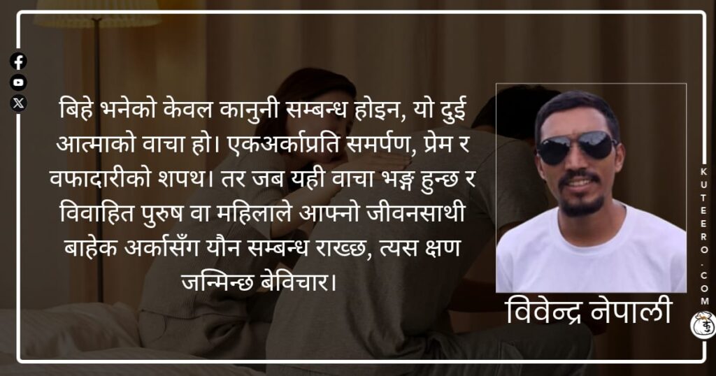 विवाहित पुरुष वा महिलाले आफ्नो जीवनसाथी बाहेक अर्कासँग यौन सम्बन्ध राख्नु बेविचार हो र यसलाई वैवाहिक विच्छेदको कानुनी कारणका रूपमा लिइन्छ। बिहे भनेको केवल कानुनी सम्बन्ध होइन, यो दुई आत्माको वाचा हो। एकअर्काप्रति समर्पण, प्रेम र वफादारीको शपथ। तर जब यही वाचा भङ्ग हुन्छ र विवाहित पुरुष वा महिलाले आफ्नो जीवनसाथी बाहेक अर्कासँग यौन सम्बन्ध […]