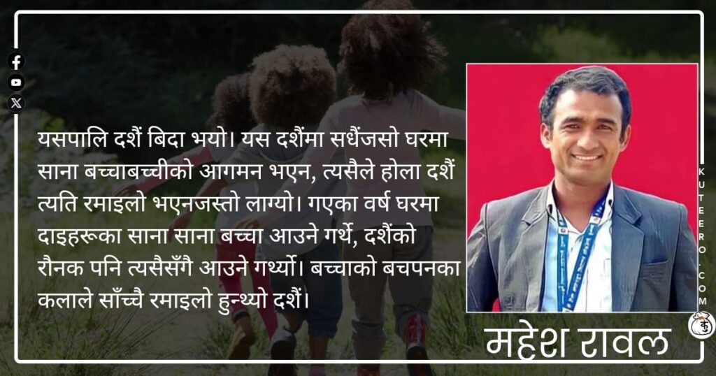 सानो बच्चाको खुशी सच्चा, निश्छल र हृदय छुने हुन्छ। प्रशंसा केवल शब्द होइन। त्यो बालहृदयमा विश्वास र माया जगाउने जादू हो। तसर्थ, हामीले बच्चाबच्चीको कामको प्रशंसा गर्नु अनिवार्य देखिन्छ। यसपालि दशैं बिदा भयो। यस दशैंमा सधैंजसो घरमा साना बच्चाबच्चीको आगमन भएन, त्यसैले होला दशैं त्यति रमाइलो भएनजस्तो लाग्यो। गएका वर्ष घरमा दाइहरूका साना साना बच्चा […]