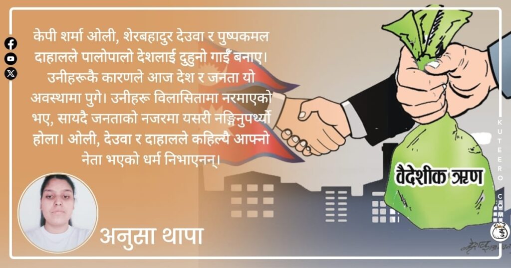 केपी शर्मा ओली, शेरबहादुर देउवा र पुष्पकमल दाहालले पालोपालो देशलाई दुहुनो गाईँ बनाए। उनीहरूकै कारणले आज देश र जनता यो अवस्थामा पुगे। उनीहरू विलासितामा नरमाएको भए, सायदै जनताको नजरमा यसरी नङ्गिनुपर्थ्यो होला। ओली, देउवा र दाहालले कहिल्यै आफ्नो नेता भएको धर्म निभाएनन्। २०७२ असोज ३ गते नेपालको संविधान जारी भयो। संविधानपछि मुलुक संघीयतामा गयो। देशमा […]