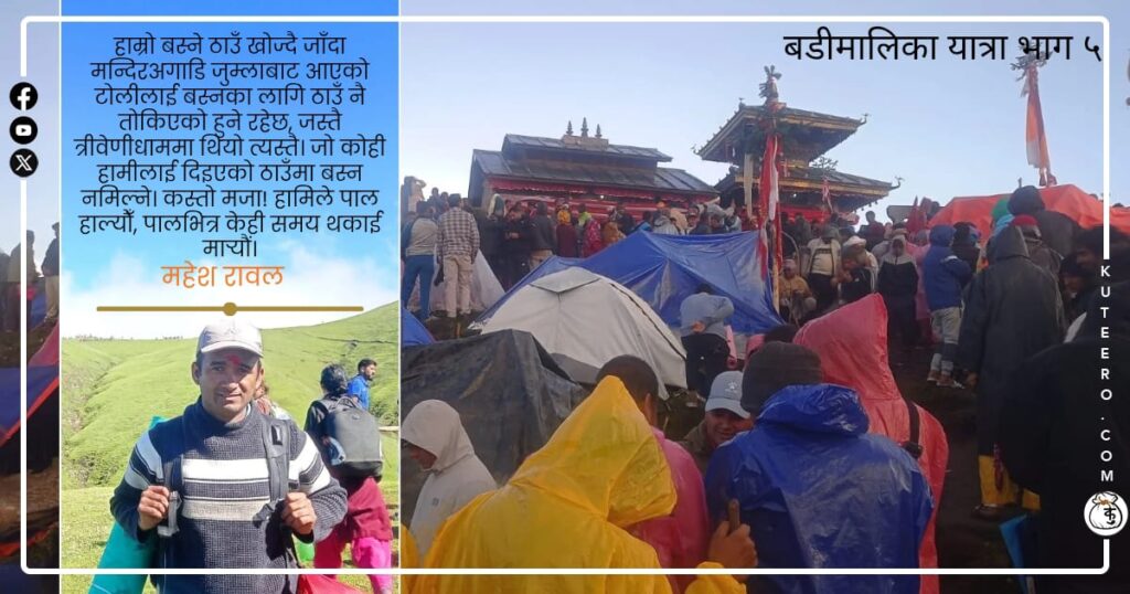 बडीमालिका यात्रा भाग ५ हाम्रो बस्ने ठाउँ खोज्दै जाँदा मन्दिरअगाडि जुम्लाबाट आएको टोलीलाई बस्नका लागि ठाउँ नै तोकिएको हुने रहेछ, जस्तै त्रीवेणीधाममा थियो त्यस्तै। जो कोही हामीलाई दिइएको ठाउँमा बस्न नमिल्ने। कस्तो मजा! हामिले पाल हाल्यौँ, पालभित्र केही समय थकाई मार्यौं। त्रीवेणिधामको सुन्दरता र हाम्रो नित्यकर्म पछि सबै तीर्थालुहरूको लाम बडिमालिका तिर जाने क्रम सुरु […]
