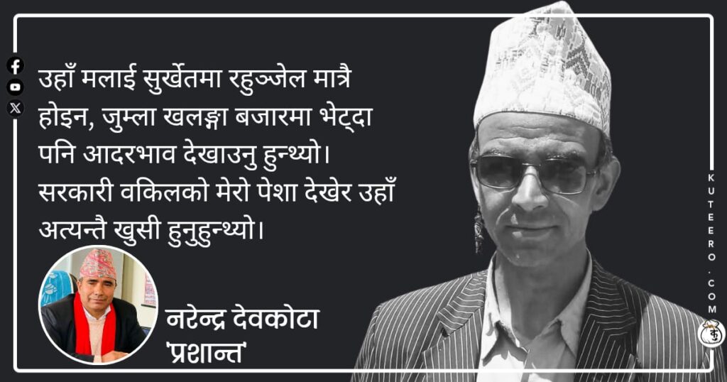 मलाई सुर्खेतमा रहुञ्जेल मात्रै होइन, जुम्ला खलङ्गा बजारमा भेट्दा पनि आदरभावले उहाँले सम्झनुहुन्थ्यो। मेरो सरकारी वकिलको पेशा देखेर उहाँ अत्यन्तै खुसी हुनुहुन्थ्यो। श्री भैरव माध्यमिक विद्यालय नराकोटका सहायक प्रधानाध्यापक तथा मेरा सुर्खेत वीरेन्द्रनगरमा पढ्दै गरेका अत्यन्तै कोमल स्वभाव, शिष्ट शैली, कसैसँग रुखो व्यवहार नगर्ने, मेरा मन परेका साथीहरू मध्येका एक हुनुहुन्थ्यो। बि.सं. २०४७ सालदेखि म […]