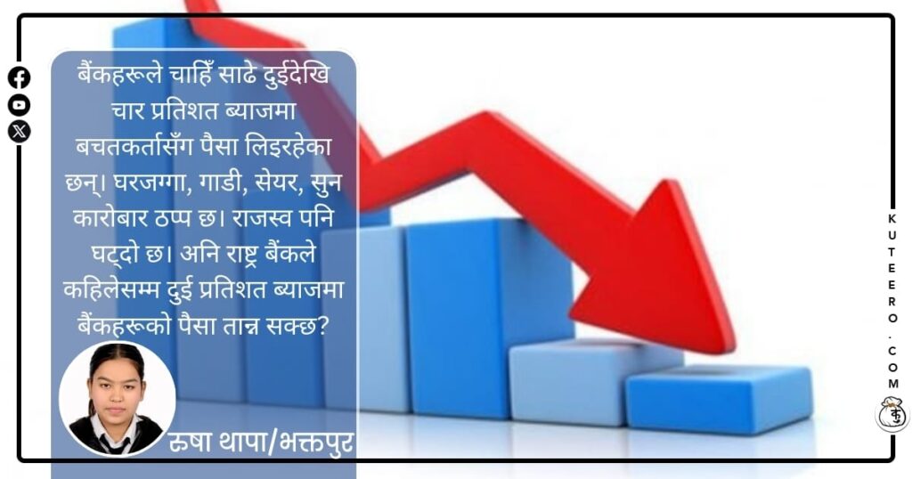 बैंकहरूले चाहिँ साढे दुईदेखि चार प्रतिशत ब्याजमा बचतकर्तासँग पैसा लिइरहेका छन्। घरजग्गा, गाडी, सेयर, सुन कारोबार ठप्प छ। राजस्व पनि घट्दो छ। अनि राष्ट्र बैंकले कहिलेसम्म दुई प्रतिशत ब्याजमा बैंकहरूको पैसा तान्न सक्छ? बैंकहरूले पनि घाटा खाएर कहिलेसम्म राष्ट्र बैंकमा पैसा राख्न सक्छन्? बैंकले कमाउने भनेकै डिपोजिटबाट हो। काठमाडौं उपत्यकासहित देशभर एक सय ३४ वटा […]