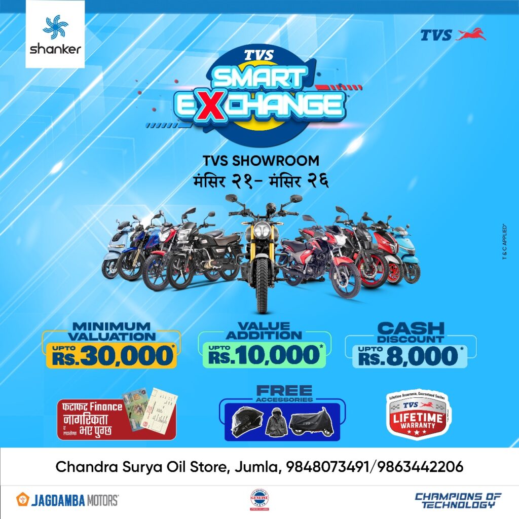 टिभिएस जुम्लाले पुराना बाइक वा स्कुटी एक्सचेन्ज गर्न चाहने ग्राहकहरूका लागि ‘टिभिएस एक्सचेन्ज अफर’ संचालन गर्ने भएको छ। जुम्लामा दुई चक्के सवारीसाधन टिभिएसको आधिकारिक बिक्रेता टिभिएस जुम्लाले पुराना बाइक वा स्कुटी एक्सचेन्ज गर्न चाहने ग्राहकहरूका लागि यही मंसिर २१ देखि २६ गतेसम्म ‘टिभिएस एक्सचेन्ज अफर’ नामक विशेष अफर संचालन गर्न लागेको हो । जुम्लाको जुगाड […]