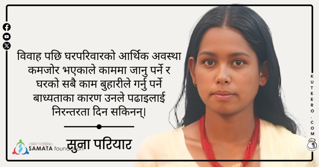 एक त महिला त्यसमा पनि दलित समुदायको महिला भएपछि धेरै विभेद र हिंसा भोग्नु परको सुना बताउँछिन् । समाजमा सार्वजनिक स्थल, धारा, विवाह, वर्तबन्ध र भोजमा जाँदा उनले दलित भएकै कारणले जातीय विभेद भोगिन् । सुना परियारको जन्म भारतमा भएको हो । उनको परिवार भारतमा काम गर्ने सिलसिलामा उतै बसोबास गर्ने भएकाले उनको बाल्यकाल भारतमा […]