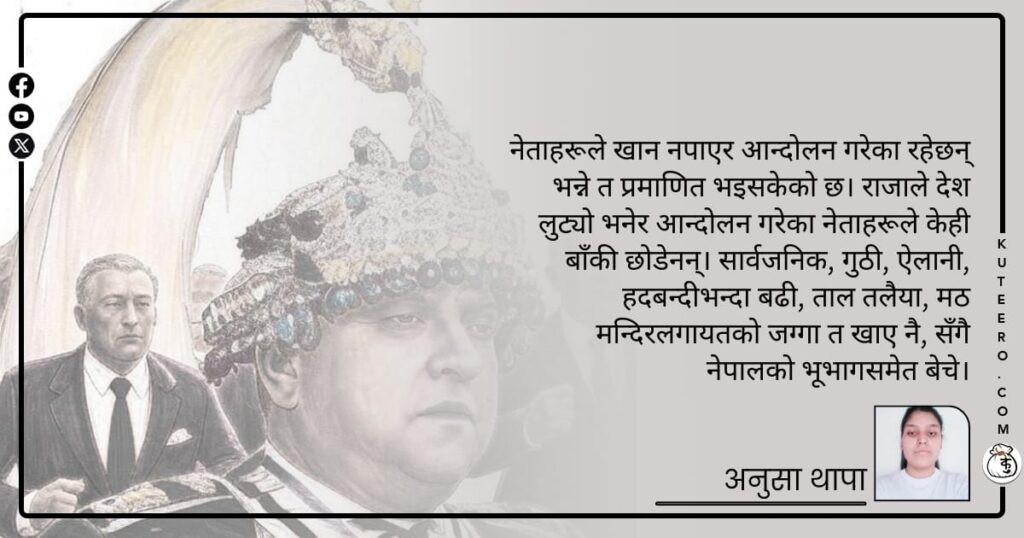 नेताहरूले खान नपाएर आन्दोलन गरेका रहेछन् भन्ने त प्रमाणित भइसकेको छ । राजाले देश लुट्यो भनेर आन्दोलन गरेका नेताहरूले केही बाँकी छोडेनन् । सार्वजनिक, गुठी, ऐलानी, हदबन्दीभन्दा बढी, ताल तलैया, मठ मन्दिरलगायतको जग्गा त खाए नै, सँगै नेपालको भूभागसमेत बेचे । राजनीतिक दलहरूले २०४६ सालअघि र पछि नै राजतन्त्रको विरोध गरे । राजाले नेपाली पैसा […]