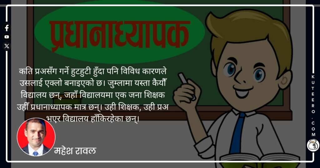तर एउटा प्रअले आफ्नो जीवनकालमा यस्ता कैयौँ काम गर्नु पर्छ, जुन नचाहेर भए पनि विद्यालयको उन्नतिका लागि गर्नै पर्ने बाध्यता आउँछ । हाल विद्यालय शिक्षाको गुणस्तर अभिवृद्धि गर्न धेरै प्रयास भइरहेका छन् । विशेषगरी प्रशासन चुस्त दुरुस्त भएका विद्यालयमा शैक्षिक अवस्था राम्रो देखिनु कुनै संयोग होइन । विगतका धेरै अध्ययन, अनुसन्धानहरूले पनि विद्यालयको सफलतासँग प्रधानाध्यापकको […]