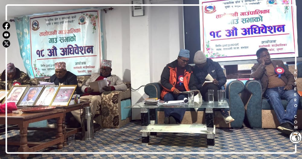 तातोपानी गाउँपालिका, जुम्लाको आर्थिक वर्ष २०८२/०८३ को हिउँदे गाउँ अधिवेशन सम्पन्न भएको छ। अधिवेशनमा बजेट संशोधन, खर्च प्रगति समीक्षा, स्थानीय कानून निर्माण तथा जलवायु परिवर्तनसम्बन्धी नयाँ परियोजना सञ्चालनबारे छलफलका लागि प्रस्ताव गरिएको छ। अधिवेशनलाई सम्बोधन गर्दै गाउँपालिकाका अध्यक्ष नन्दप्रसाद चौलागाईंले योजना र कार्यक्रम सफल बनाउन कार्यान्वयन पक्षलाई प्राथमिकतामा राखिएको बताए। उनले भने, ‘योजना प्रस्तुत गर्नु […]