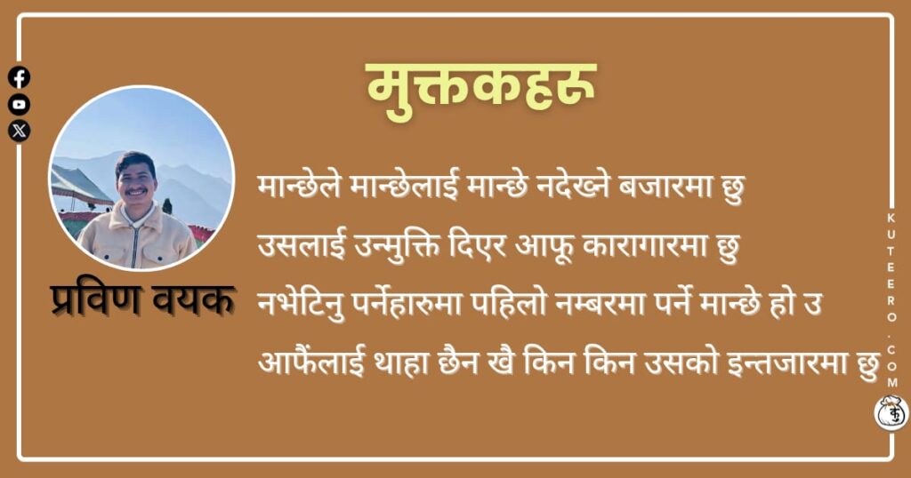 जिन्दगी थाक्दा थाक्दै थकाइको आसनमा परिसक्योचोट कहाँ छ भनेर नसोध मनमा परिसक्योअरे यार तिमी साथ चाहिने कुरा गर्छौ अझैके थाहा तिमीलाई जीवन एठनमा परिसक्यो मान्छेले मान्छेलाई मान्छे नदेख्ने बजारमा छुउसलाई उन्मुक्ति दिएर आफू कारागारमा छु।नभेटिनु पर्नेहारुमा पहिलो नम्बरमा पर्ने मान्छे हो उआफैंलाई थाहा छैन खै किन किन उसको इन्तजारमा छु एकहोरो फलिरहेए बेला अङ्कुश बनेर […]