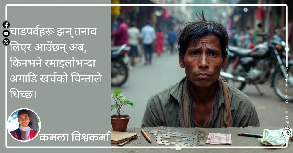 चाडपर्वहरू झन् तनाव लिएर आउँछन् अब, किनभने रमाइलोभन्दा अगाडि खर्चको चिन्ताले थिच्छ। एक व्यक्तिले सुनाउँछन् आफ्नो अवस्था बारे, अनि म चुपचाप सुनी रहने प्रण गर्दै छु। कुरा यसरी सुरु हुन्छ। जीवनका धेरै पाटाहरू पार गर्दै आज म यो मोडमा उभिएको छु, जहाँ हरेक निर्णयमा पैसाले नै कुरा गर्छ। हरेक सम्बन्धको नापतौल पनि अहिले आर्थिक अवस्थाले […]