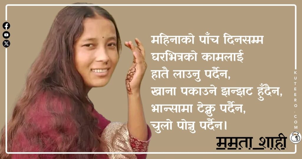 मेरी दिदी/भाउजूहरूछुट्टै सानो घरमा बसेको देख्दा,म सोच्थेँ“कति मज्जा हुन्छ है!”महिनाको पाँच दिनसम्मघरभित्रको कामलाईहातै लाउनु पर्दैन,खाना पकाउने झन्झट हुँदैन,भान्सामा टेक्नु पर्दैन,चुलो पोत्नुपर्दैन।बिहानै उठेर देउरालीको पँधेरीबाटपानी बोक्नुपर्दैन,गाईगोठबाटगोबर सोहोर्नुपर्दैन।पकाएर दिएको खायो,आनन्दले सुत्यो,र सुत्ने बेलामा सुन्नुपर्दैनयति धेरै मान्छेकोगुनगुन् आवाजत्यो सानो घरभित्र।यही सब सोच्ने गर्थेँम नौ – दश वर्षकी हुँदामेरो बालमनलाई लाग्थ्यो,त्यो सानो घरआरामको घर हो, आनन्दको घर हो। तर, […]
