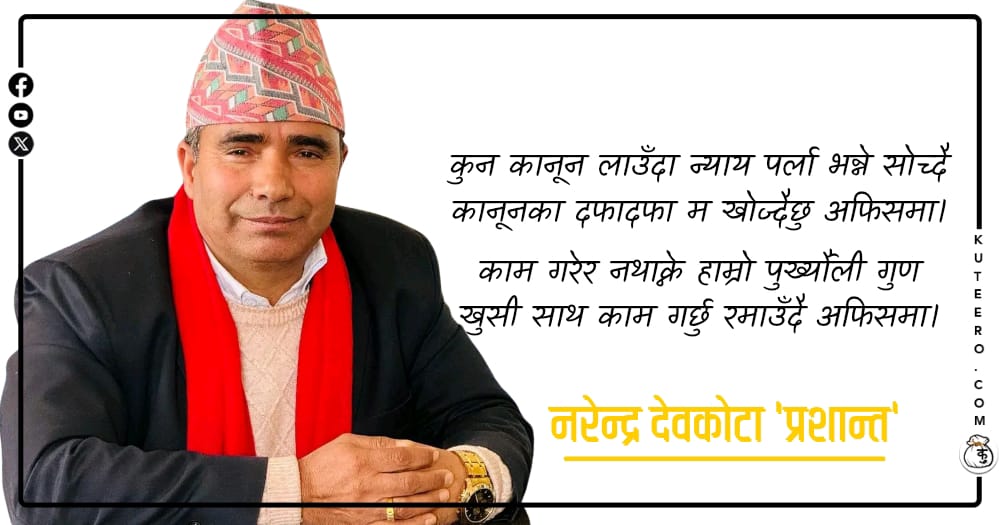 मिठो मुस्कान लिएर आउँदैछु अफिसमासाहस त्यो देखाउँदै गाउँदैछु अफिसमा। कुन कानून लाउँदा न्याय पर्ला भन्ने सोच्दैकानूनका दफादफा म खोज्दैछु अफिसमा। काम गरेर नथाक्ने हाम्रो पुर्ख्यौली गुणखुसी साथ काम गर्छु रमाउँदै अफिसमा। पीडा साँचेर धर्तीमा बाँच्न कत्ति मन छैनकामसकि फुर्सदमा लौ नाच्दैछु अफिसमा। सरकारी वकील हुँ समाजको अभियन्ताजनताको सेवा गर्न धाउँदैछु अफिसमा। खुसी मनले फर्कियोस् जनता […]