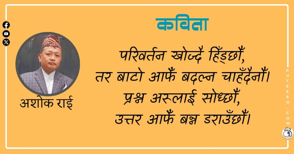 खै उज्यालो सबैतिर,अन्धकारले सहरदेखि गाउँसम्म छोपेको छ,सपना बोकेको देश,आफ्नै पीडामा चुपचाप रोएको छ। भन्छन्—देश बिग्रियो,नेताले मात्रै बिगार्यो रे।तर ऐनामा हेर्ने आँट कसैसँग छैन,गल्ती स्वीकार्ने साहस हरायो रे। हामीले नै छानेका हातहरू हुन्,हामीले नै दिएको शक्ति हो।आज गाली गर्ने ती ओठहरूले,हिजो ताली बजाएको सत्य हो। हकको कुरा आउँदा,हामी सबै जाग्छौँ।कर्तव्य सम्झाउने बेला,हामी सबै भाग्छौँ। परिवर्तन खोज्दै […]