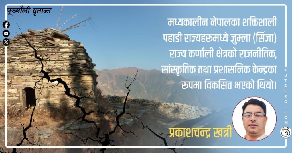 मध्यकालीन नेपालका शक्तिशाली पहाडी राज्यहरूमध्ये जुम्ला (सिंजा) राज्य कर्णाली क्षेत्रको राजनीतिक, सांस्कृतिक तथा प्रशासनिक केन्द्रका रूपमा विकसित भएको थियो। कल्याल शासकहरूको नेतृत्वमा स्थापित यस राज्यले पश्चिमी नेपालमा लामो समयसम्म प्रभाव कायम राखे पनि अन्ततः आन्तरिक दुर्बलता, बाह्य राजनीतिक दबाब, आर्थिक संरचनाको अवमूल्यन तथा सामाजिक, सांस्कृतिक परिवर्तनका कारण पतनको मार्ग समात्न बाध्य भयो। यस लेखमा जुम्ला […]